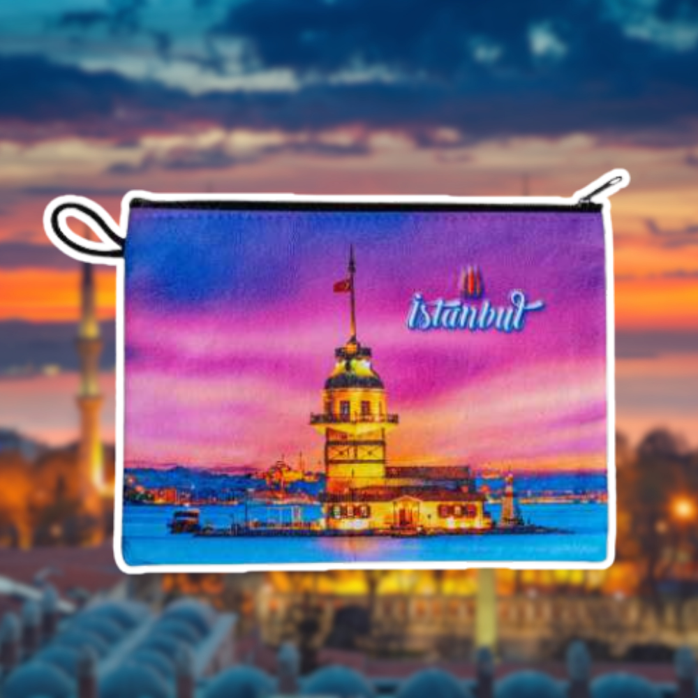 İstanbul Kız Kulesi Temalı Fermuarlı Cüzdan, gün batımı renkleriyle hazırlanmış Kız Kulesi manzarasını şık ve pratik bir kullanım ile birleştirir. Üzerindeki “İstanbul” yazısı ve canlı baskı detayı sayesinde hem günlük kullanımda dikkat çeken bir aksesuar olur hem de İstanbul’dan alınabilecek anlamlı bir hatıra olarak öne çıkar.