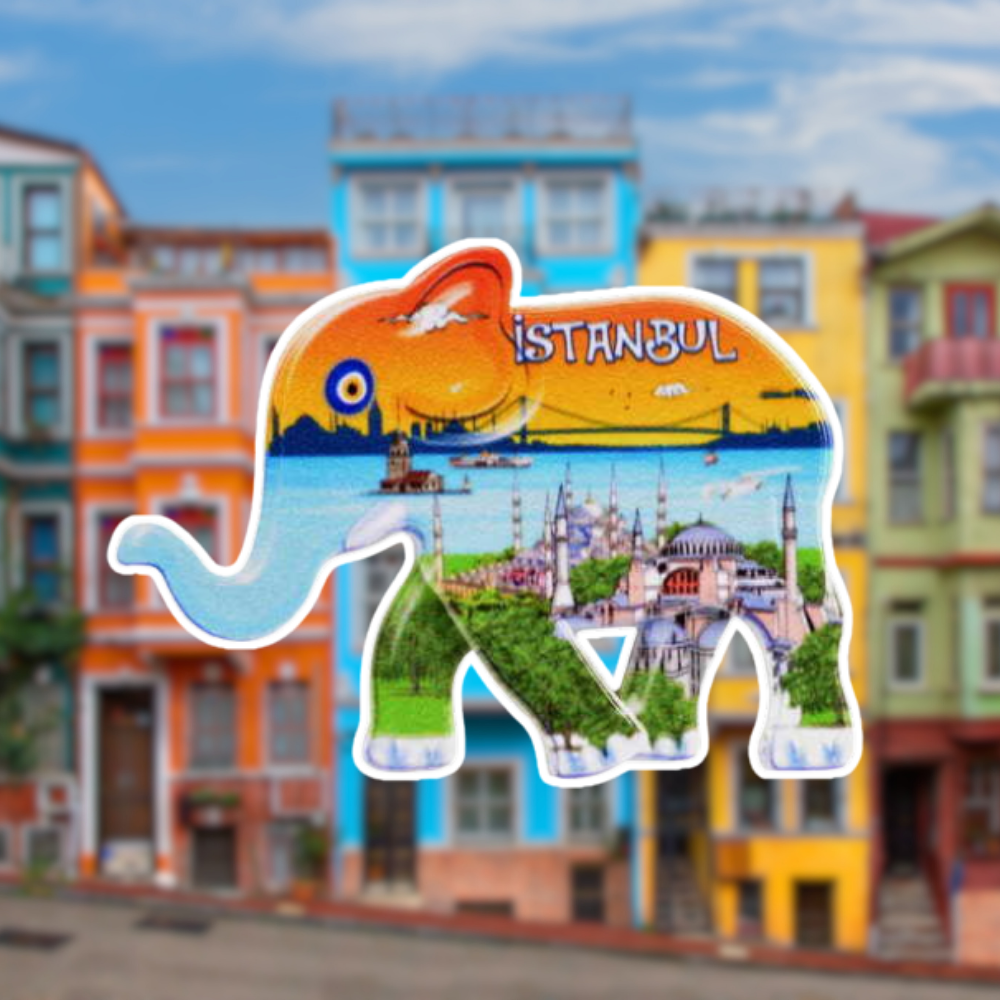 Fil Figürlü İstanbul Magnet, fil formundaki özel kesimi ve içindeki İstanbul temalı illüstrasyonu (tarihi yarımada, boğaz ve silüet detayları) ile buzdolabı ve metal yüzeylerde şık bir hatıra ürünü sunar.