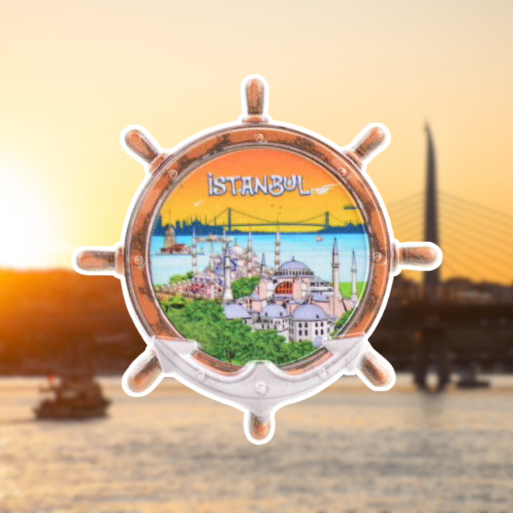 İstanbul Temalı Dümen Magnet, gemi dümeni formundaki özel kesimi ve merkezindeki İstanbul illüstrasyonu (tarihi yarımada silüeti ve boğaz detayları) ile buzdolabı ve metal yüzeylerde hem dekoratif hem de kullanışlı bir hatıra ürünüdür.